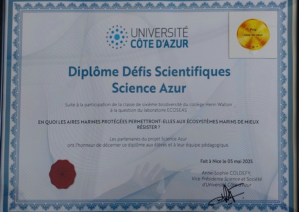 Lundi 5 mai, les élèves de la classe de 6ème environnement se sont rendus à Nice dans le cadre des "Défis scientifiques" de l'Université de la Côte d'Azur. Ils ont pu profiter des animations sur place, découvrir une partie de la ville et présenter leur travail en conférence. Leur prestation de qualité, remarquée par le jury, leur a valu un prix!