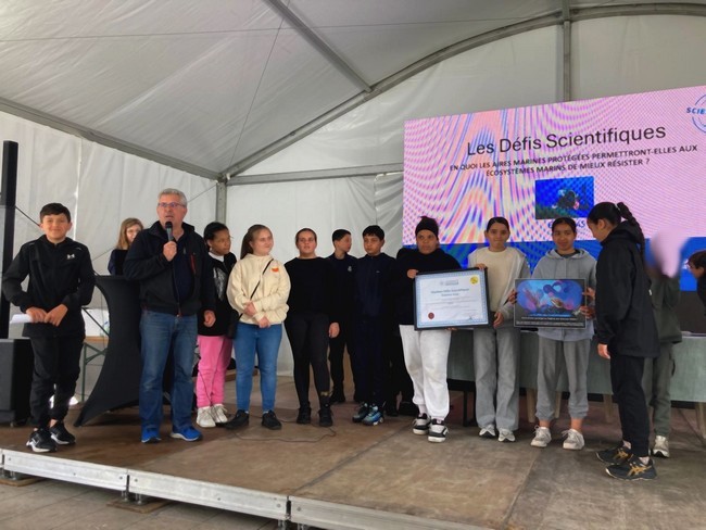 Après leur intervention d'autre classes de lycée sont intervenues, passé la surprise d'être les seuls collégiens, nos élèves ont pu se rendre compte que leur travail était aussi qualitatif que celui de leurs ainés! Cela leur a valu de recevoir du jury (composé de scientifiques) le prix "Coup de coeur du jury" ex-aequo avec les terminales! Les élèves ont pu partager ce moment de fierté sur scène! Ils ont aussi reçu deux petites BD chacun et un tirage d'une oeuvre d'art pour la classe.