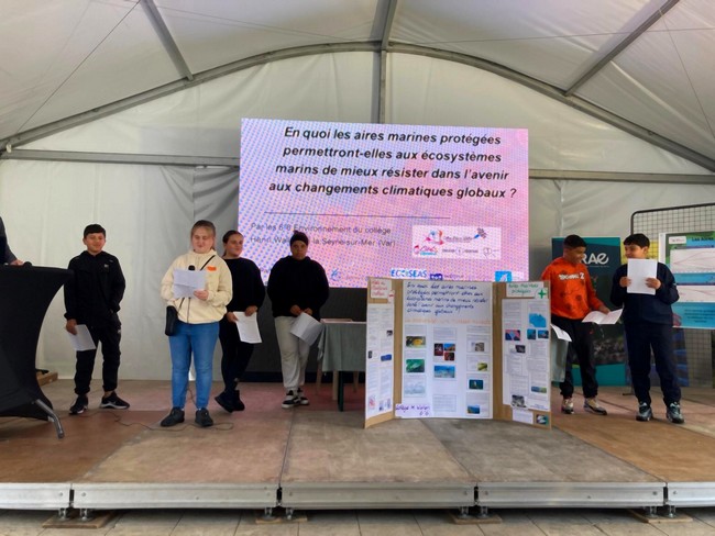 Après quelques péripéties avec le car, les élèves et leurs professeurs ( Mme Riquelme et M Peyret ) sont arrivés pile à l'heure de leur passage à la conférence. Heureusement nous avions "révisé" dans le car! Cinq élèves se sont succédés sur scène pour répondre à une problématique pointue "En quoi les aires marines protégées permettront-elles dans l'avenir aux écosystèmes de mieux résister aux changements climatiques globaux?