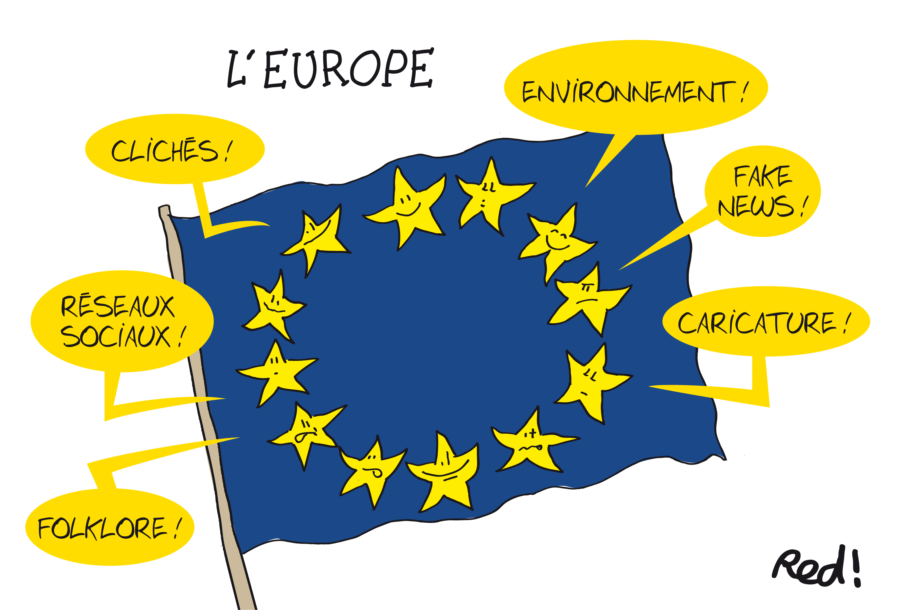 Dans le cadre du projet d'Education aux Médias et à l'Information mené au sein de la cité éducative de la Seyne sur mer, entre les 3 collèges Paul Eluard, Curie et Wallon, les 4e4 et 4e8 ont réalisé deux panneaux d'information et des podcasts sur la thématique de l'Europe. Ceux-ci vont être mis en page par un graphiste. Au total, ce sont 6 kakémonos sur la thématique de l'Europe qui circuleront à la rentrée dans les écoles primaires de la cité éducative. Les élèves, qui seront en 3e l'an prochain, seront les médiateurs de l'exposition. Chaque panneau porte sur une sous-thématique particulière : infox, caricature, clichés, folklore, réseaux sociaux, environnement.