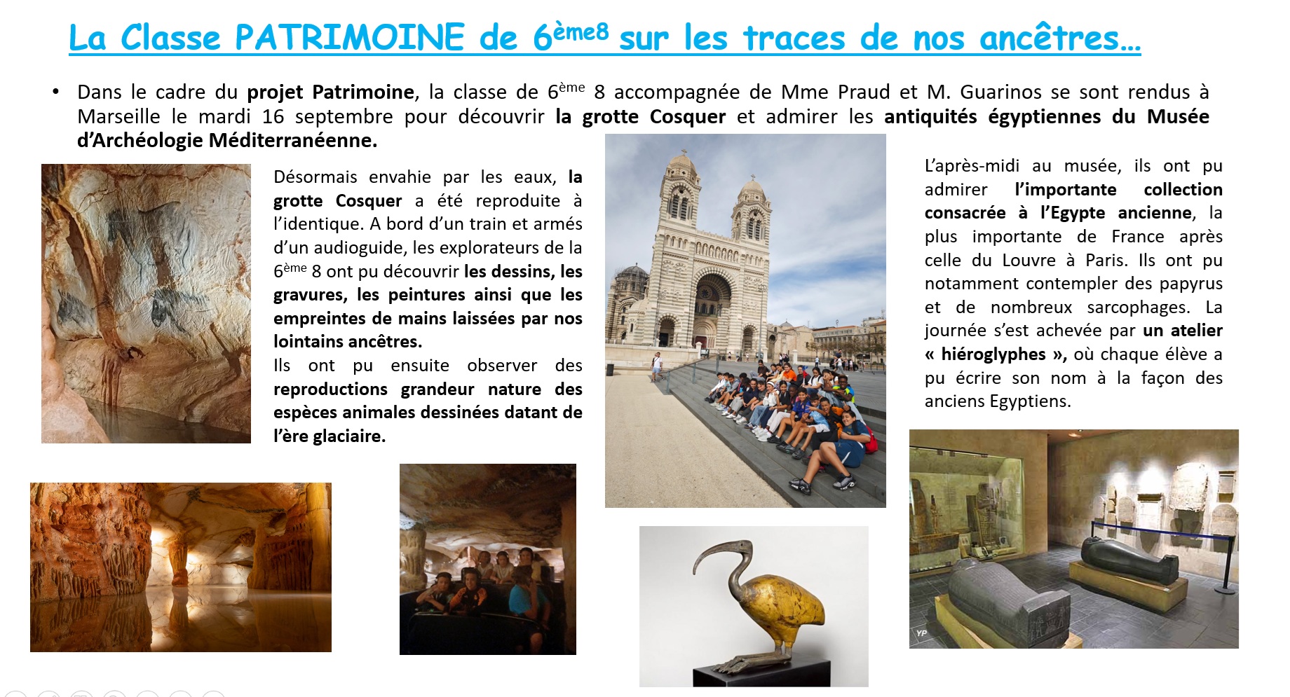 Dans le cadre du projet patrimoine, les élèves de la classe de 6ème8, accompagnés de Mme Praud et M. Guarinos, se sont rendus à Marseille, le mardi 16 septembre, pour découvrir la grotte Cosquer et admirer les antiquités égyptiennes du musée d'Archéologie Méditerannéenne. Vous pouvez admirer le visuel de cette visite ci-dessous !