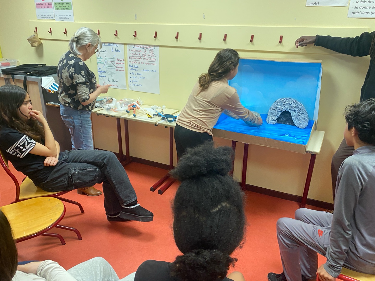 Depuis le mois de janvier, les élèves ont adapté leur texte sous la forme d’un Kamishibaï. Cela a pu se faire grâce au partenariat avec la médiathèque André Chedid.